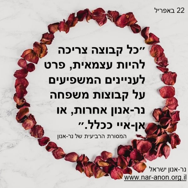 כמשתתפת קבועה בפגישות נר-אנון, אני יכולה לומר בכנות שכעת אני יכולה להנמיך את הציפיות שלי. בספרון הכחול שלנו כתוב: ״אל תקדיש מחשבה למעשים העתידיים של אחרים. אל תצפה מהם להפוך ליותר טובים או ליותר רעים עם הזמן, כי כאשר יש לך ציפיות כאלה, אתה בעצם מנסה לברוא״. לצפות מהמכור לא להתנהג כמכור זוהי התכחשות למציאות. גיליתי שאני הרבה יותר שמחה כאשר אני מנמיכה או מוותרת על ציפיותיי מהמכור, מאחרים ומעצמי.